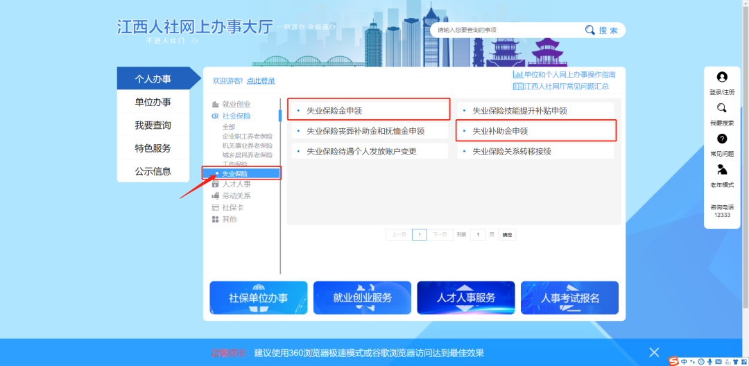 (3)江西政務(wù)服務(wù)網(wǎng)、江西人社網(wǎng)上辦事大廳:本人注冊(cè)并登陸江西政務(wù)服務(wù)網(wǎng)(http://www.jxzwfww.gov.cn)或江西人社網(wǎng)上辦事大廳(http://zwfw.rst.jiangxi.gov.cn),選擇“社會(huì)保險(xiǎn)”找到“失業(yè)保險(xiǎn)”,選擇“失業(yè)保險(xiǎn)金申領(lǐng)”或“失業(yè)補(bǔ)助金申領(lǐng)”點(diǎn)擊填寫相應(yīng)信息申領(lǐng)。