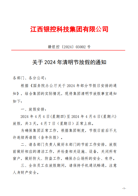 請各部門提前做好工作安排,放假前確保關(guān)閉門窗、電源,消除安全隱患。節(jié)假日期間大家做好人身財產(chǎn)安全防護(hù)!